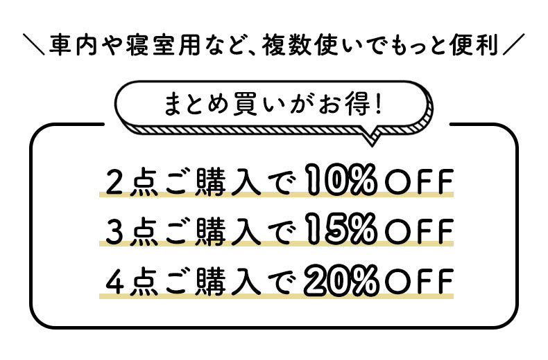 はい、2点で10%、3点で15%、4点で20%まで割引が適用されます。ご自身で複数使いたい場合や、家族やお友達へのプレゼントなどでお得にご購入いただけます。