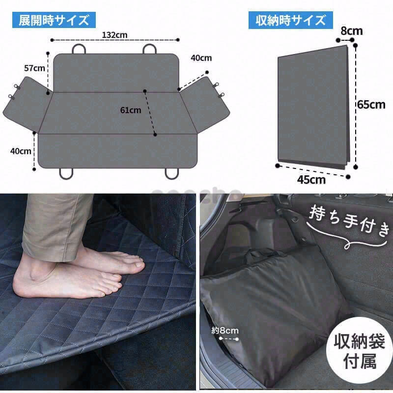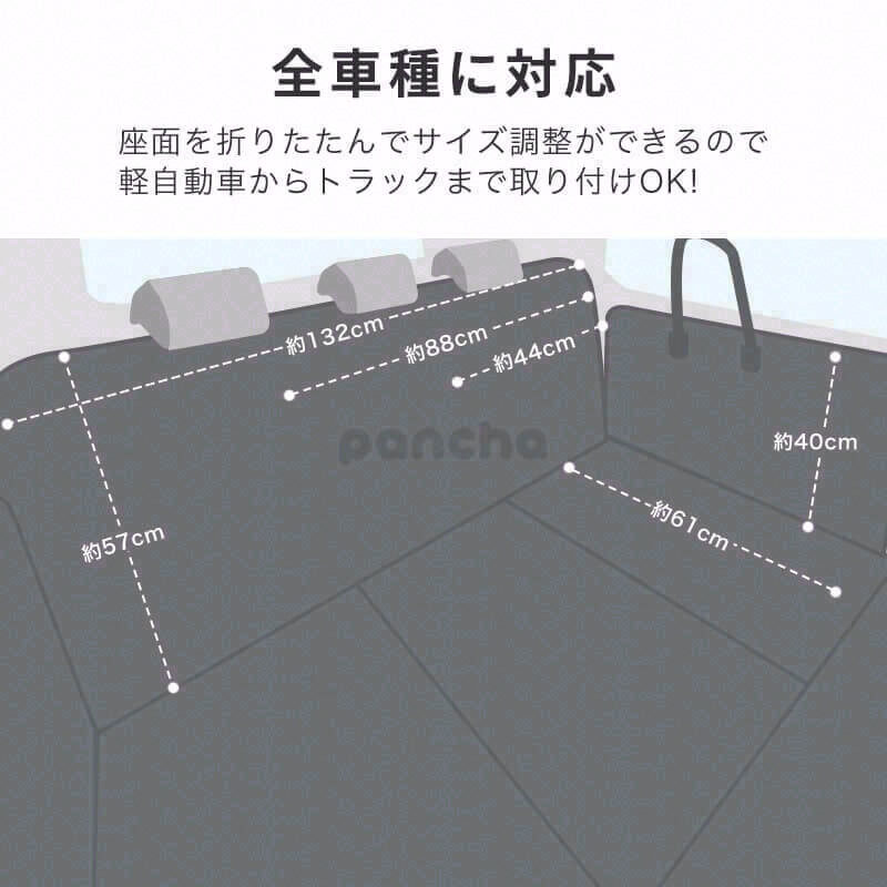幅132cm, 奥行61cm, 高さ57cmとなっており、普通車、軽自動車、SUV、セダンなど、ほとんどの車に合うように設計されています。また、長さ調節可能なストラップとサイズ調節可能な折りたたみ設計により、大小様々な車にお使いいただけます。最大120kgの耐荷重により、大型犬や多当飼いの場合でも安全に乗車することができます。